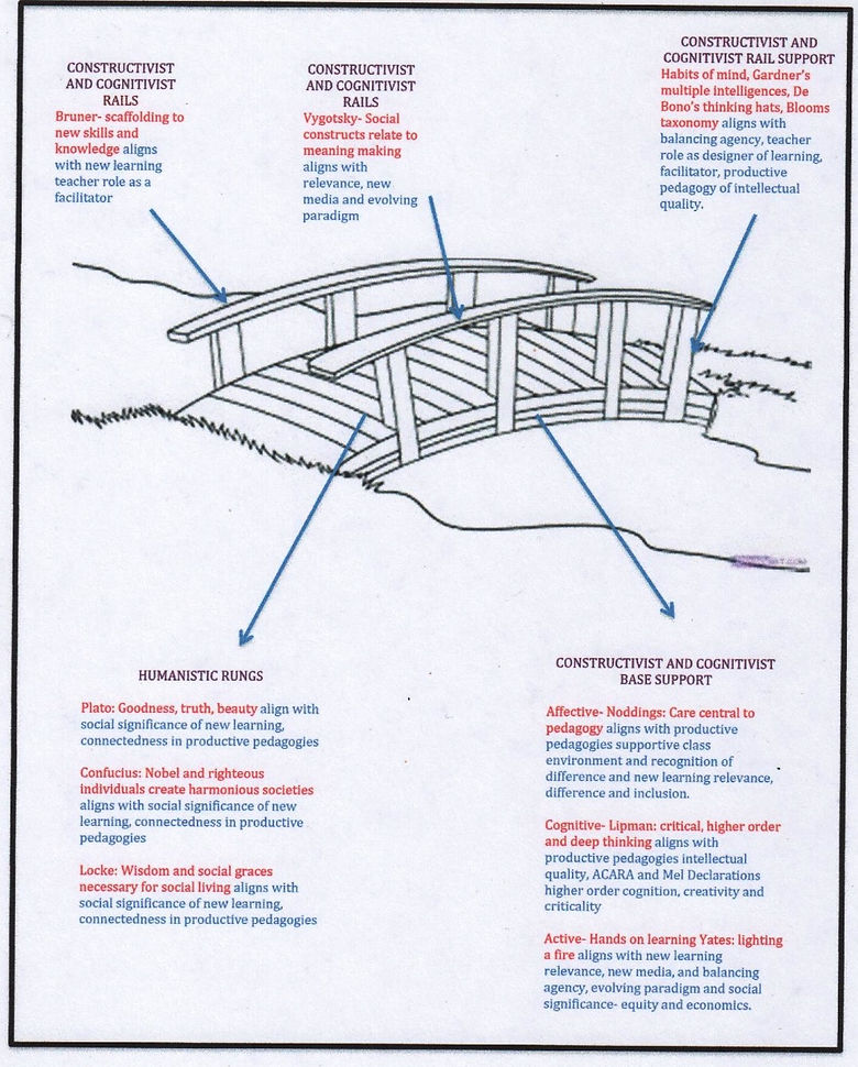 I envige my role in an Australian education system to be that of a facilitator. Metaphorically, I would consider my personal philosophy in relation to education to be that of a bridge. A bridge that facilitates the creation of sucessful learners, active and informed citzens of the future by providing well planned structures that build on prior knowledge and skills and lead to new knowledge and skills. I believe that the base of the bridge needs to comprise of strong humanistic rungs fueled by Plato's ideas of goodness and truth, Confuciuses ideals of nobleness that leads to harmonious societies and Loche's thinking on the importance of wisdom and social graces. In addition, I believe, as Nel Noddings suggests, that care is central to pedagogy and that critical and deep thinking should be an integral part of learning as it fosters intellectual quality, as Lipman suggests, a vital need in our age of mass information. These ideals ensure that learning is socially meaningful and significant for students and assists in creating connections with students at a personal level thereby maintaining a supportive classroom environment. As a facilitator, I would focus on well planned scaffolds, the rails of the bridge, in the ideals of Bruner who considered pedagogy to be a blend of cognitivist and constructivist approaches, where by learning initiates from known concrete contexts and is supported to foster new abstact ideas. Vygotsky considered meaning making to relate to social constructs and in the contemporary context, it is vital to foster collaborative skills and teamwork as well as explicitly teach social skills, particularly in the special needs context. I also believe that in this rapidly changing era, educators ought to adopt the best possible means of meaning making that leads to enthusiastic, independent and informed learners, including the most appropriate technologies and evidence based research practices.